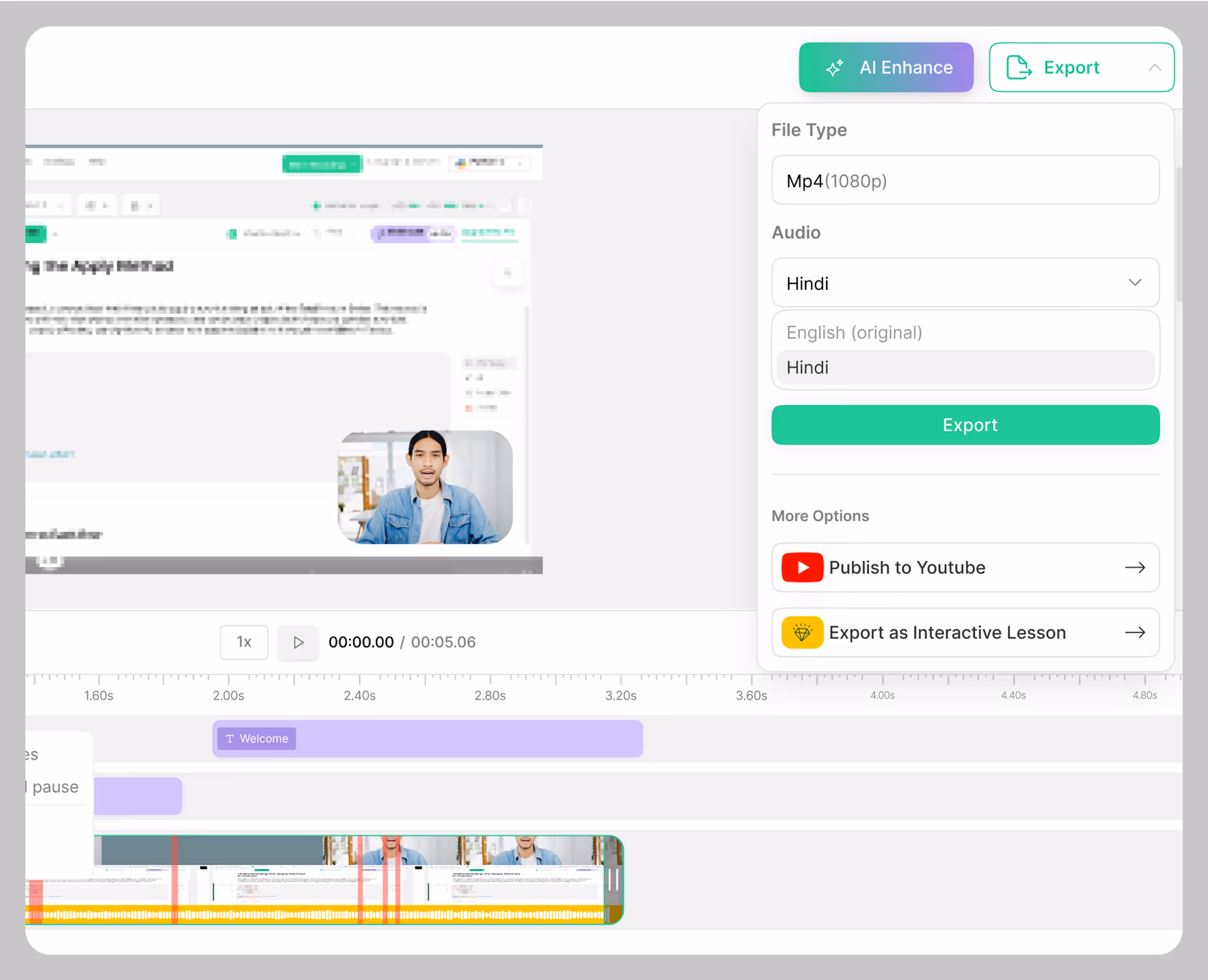 Easily translate your lessons into Hindi and other languages, with natural voice and tone. Your voice stays authentic, your content feels local, wherever it goes. Export and share in multiple languages, all set for learners worldwide.