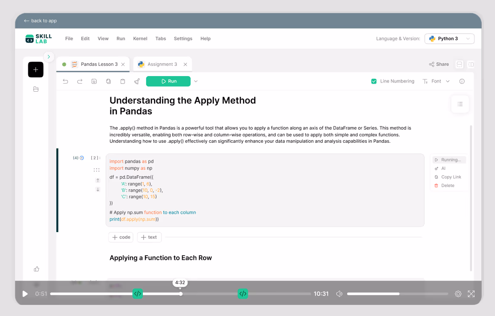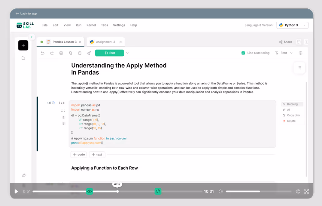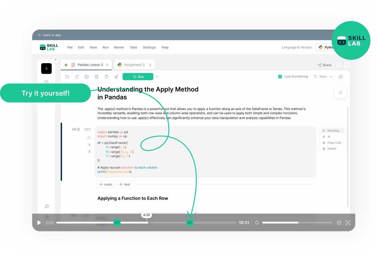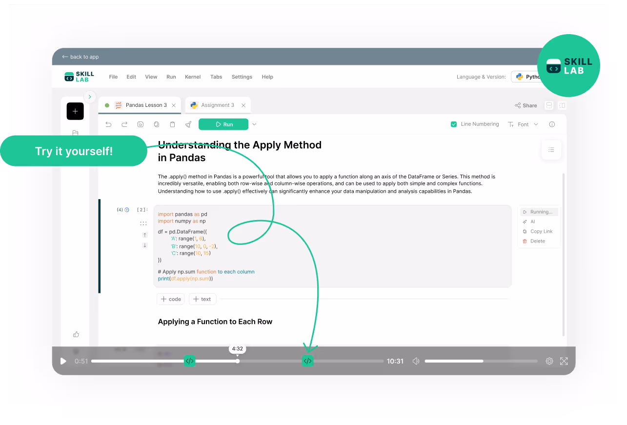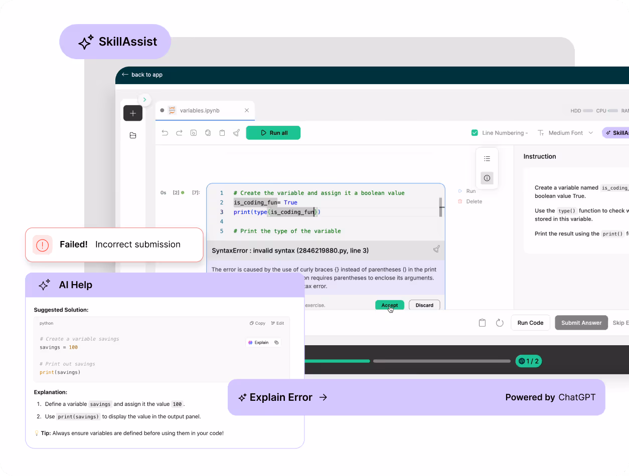 Learners practice coding directly within the platform without needing additional tools. They write, run, and fix code as they learn, without switching tabs or setting things up.