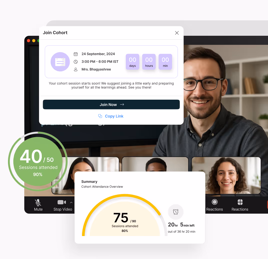 Progress tracking is built in. Students can see completed lessons, exercises, and course milestones. If you're running live cohorts, they can also track session attendance and deadlines.