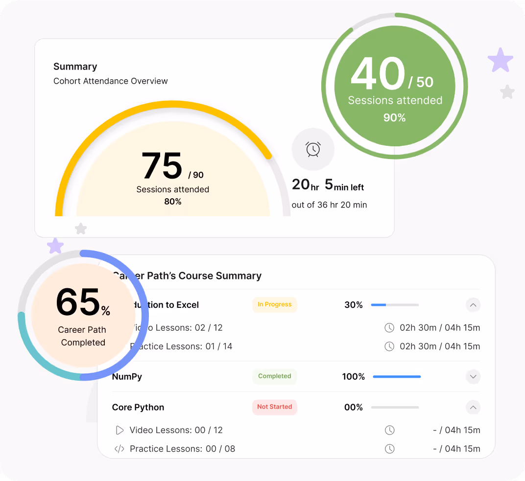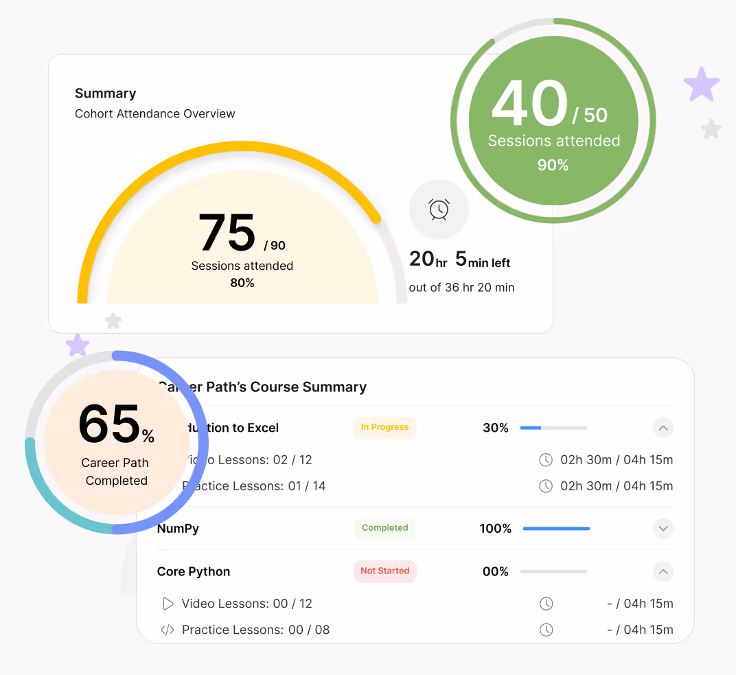 Learners track attendance, course progress, and completed exercises in one place. Cohort milestones and learning paths help them stay on track.Everything is mapped, nothing gets missed.