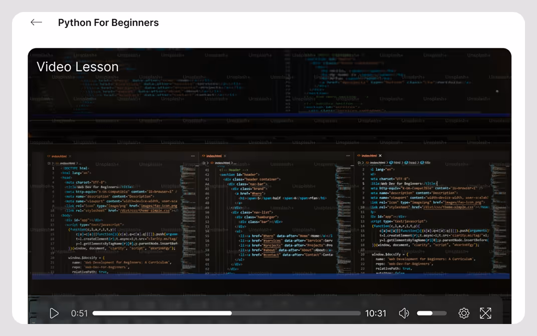 Most platforms stop at videos and leave learners figuring out the rest on their own. We bring everything into one seamless experience.Your learners watch and code along while practicing in one place so they stay focused and make real progress.